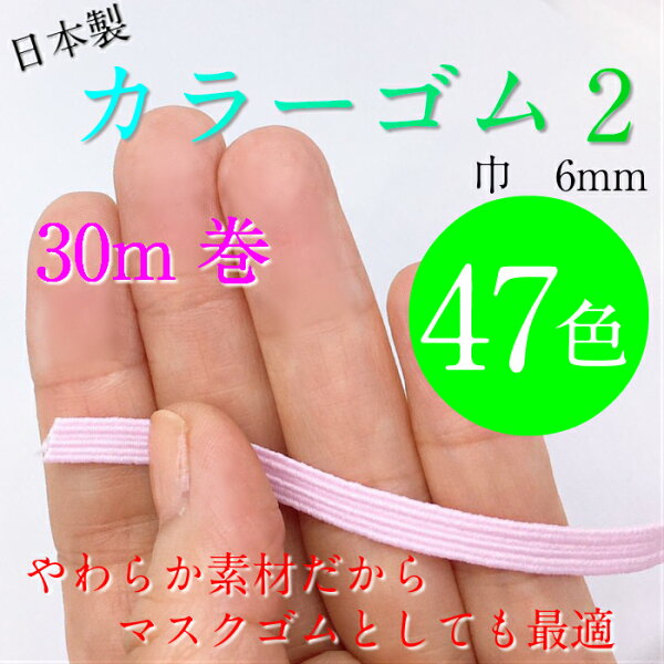 【国内生産】カラー6コールゴム やわらかい素材なのでマスクゴムとしても最適!平タイプ サイズ(巾約6mm)選べるカラーは47色30m単位販売 ポリエステル、ポリウレタン使用伸び率270%数量限定で販売中 2